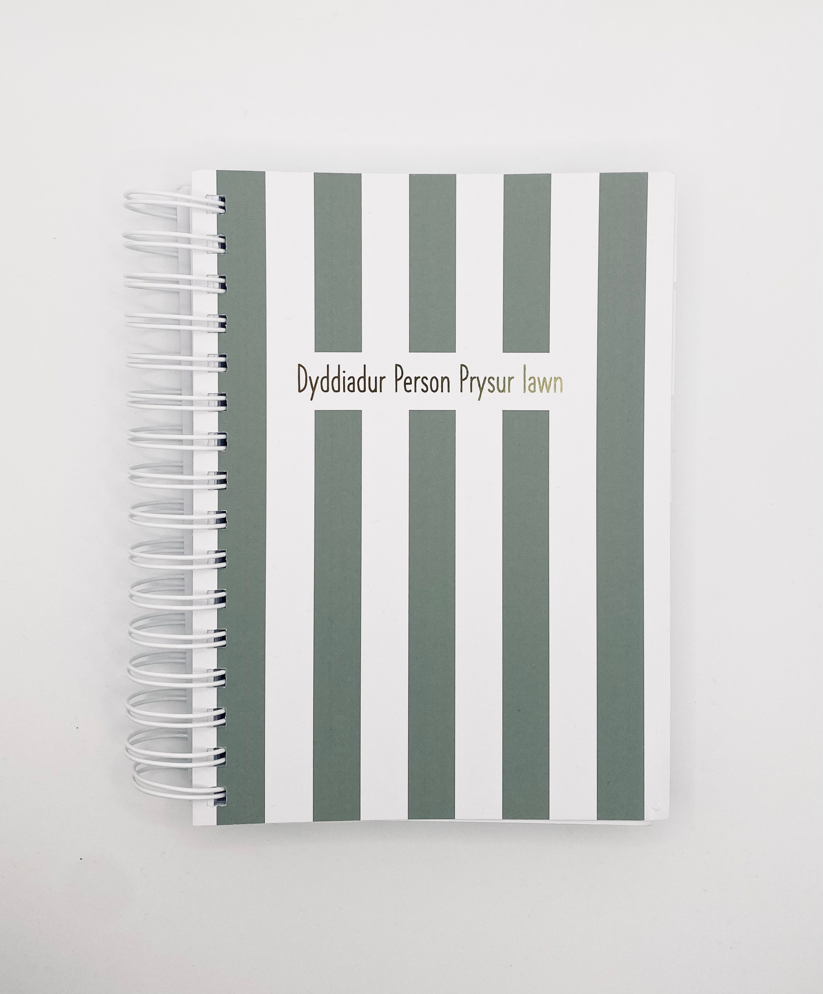 Dyddiadur A5 (dim dyddiad) gyda clawr streipog gwyrdd a gwyn ag ysgrifen aur ar y clawr. Mae'r teitl 'Dyddiadur Person Prysur Iawn' yn addas i bawb dyddie yma ac y gallwch ddechrau'r dyddiadur unrhywbryd yn y flwyddyn.